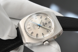 This is a beautiful Creation Automatic wristwatch in excellent condition, featuring a stainless-steel case with the bold geometric design characteristic of the 1970s. Measuring 35 × 40 mm (excluding crown), it offers a confident wrist presence while remaining comfortable for everyday wear. The brushed surfaces and sharp case lines highlight its vintage charm while giving it a clean, modern look.