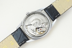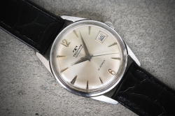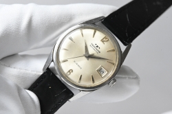 Dial: The watch showcases a striking sunburst silver dial that catches the light beautifully. Applied silver indices, matching hands, and Arabic numerals at 12 and 6 give it a classic mid-century character.