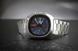 The Silverstone case is one of the most distinctive chronograph designs of the 1970s. Its bold, cushion-shaped stainless steel case reflects the era’s motorsport influence, offering strong wrist presence while remaining highly wearable. The dial is purpose-built: highly legible, functional, and unmistakably utilitarian, with vibrant chronograph hands and a clear day-date display—hallmarks of serious professional instrumentation. The case measure 40x44,5mm excluding the crown.