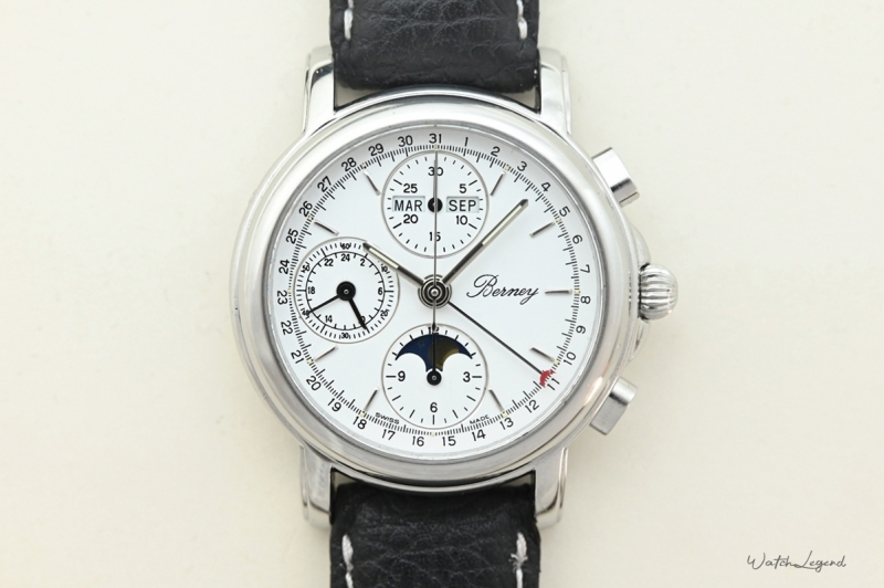 Rare et magnifique chronogrpahe Berney Calendrier Complet Phase de Lune — un garde-temps classique alliant design élégant et mouvement automatique suisse hautement respecté.