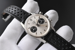 Iconic Heuer Carrera 7753SN, l’une des références les plus recherchées parmi les Carreras vintage de la fin des années 1960 et du début des années 1970. La mention “SN” signifie Silver / Noir, c’est-à-dire un cadran argenté associé à des sous-cadrans noirs – un très beau panda dial emblématique.