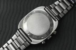 Le cadran présente un superbe motif géométrique texturé, typique des années 1970, qui confère à la montre une profondeur et une personnalité remarquables. Selon l’angle et l’intensité de la lumière, le cadran change subtilement d’aspect, passant d’un bleu sombre presque mat à des reflets plus lumineux et dynamiques. Ce jeu de lumière met en valeur la construction du cadran et renforce son caractère technique, tout en apportant une dimension esthétique rare sur un chronographe de cette époque.